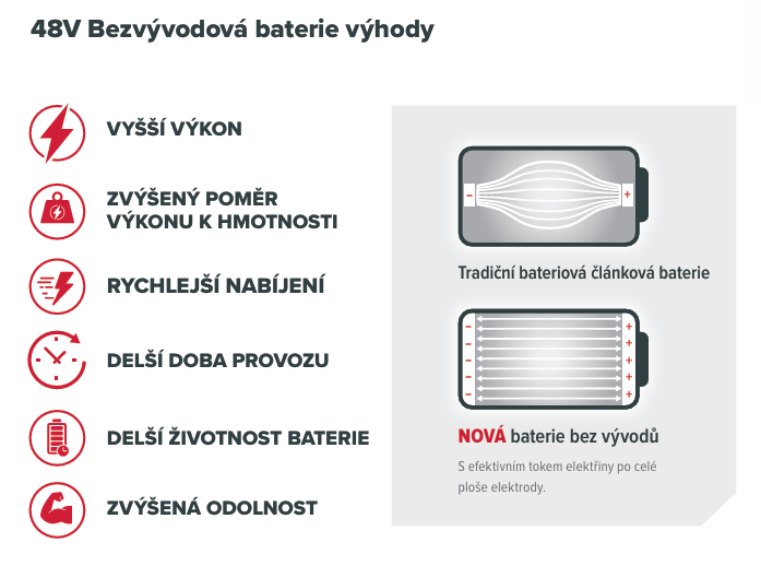 Modely 48BT216 a 48BT170 představují nejnovější inovaci v oblasti bateriových technologií pro zahradní techniku, nyní s technologií bezvývodové konstrukce článků.